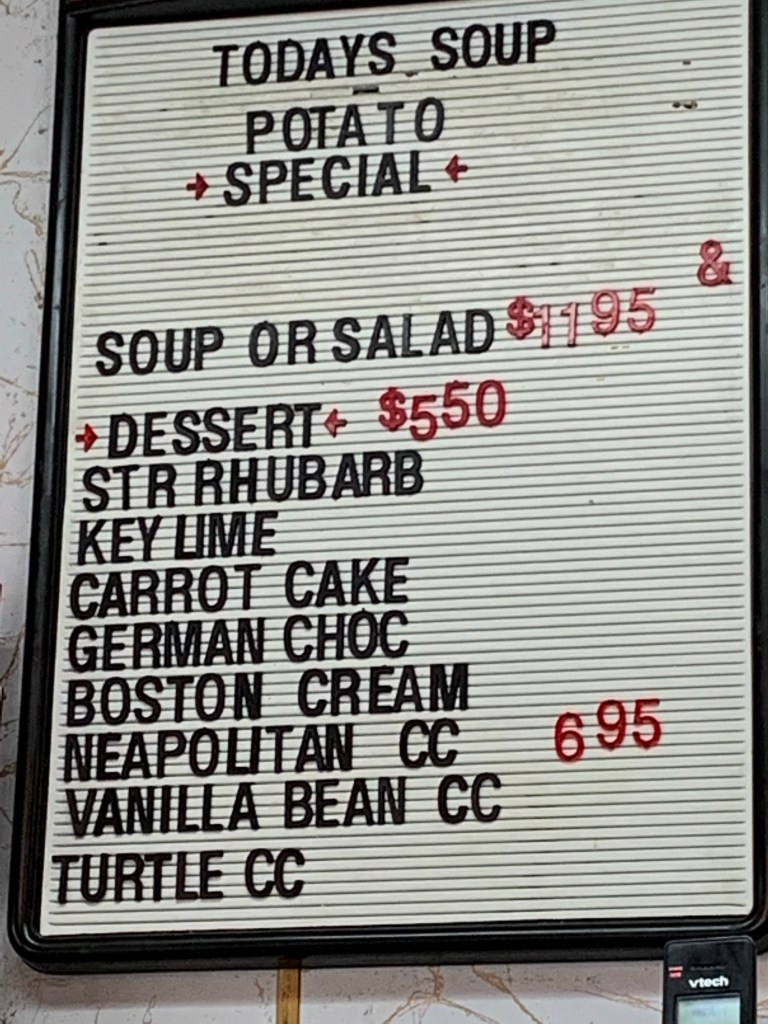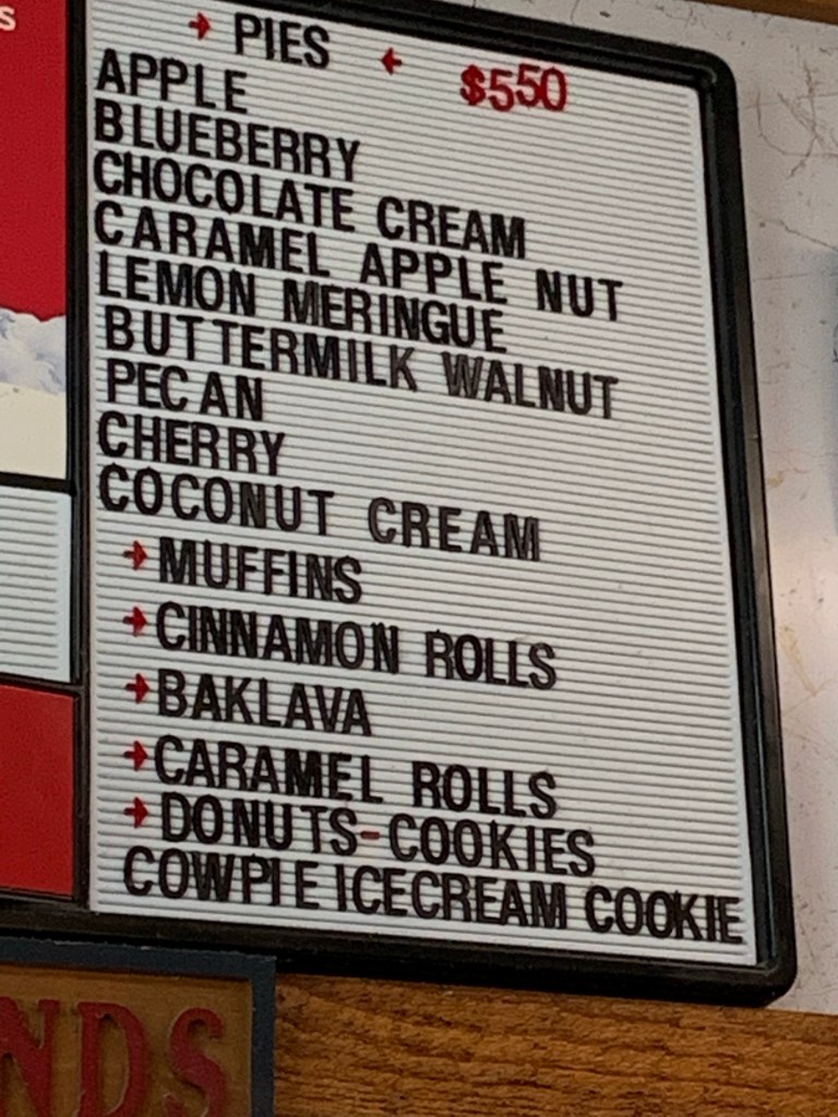 After another 8 miles on Hwy 12 they stopped for a bit before continuing the climb. the temperature was 47. At this break they were talking about stopping for something g hot for lunch. They wanted 8 miles but I stopped at the Avon Family Cafe so they could warm up, enjoy some hot food, & visit with the locals. When I got here there was ONE car here. When they got here the joint was PACKED! The Pie connoisseur commented, “this is my kinda place. I’ve struck gold!” We sat at the bar and the waitress bumped us to the top of the ordering pecking order.