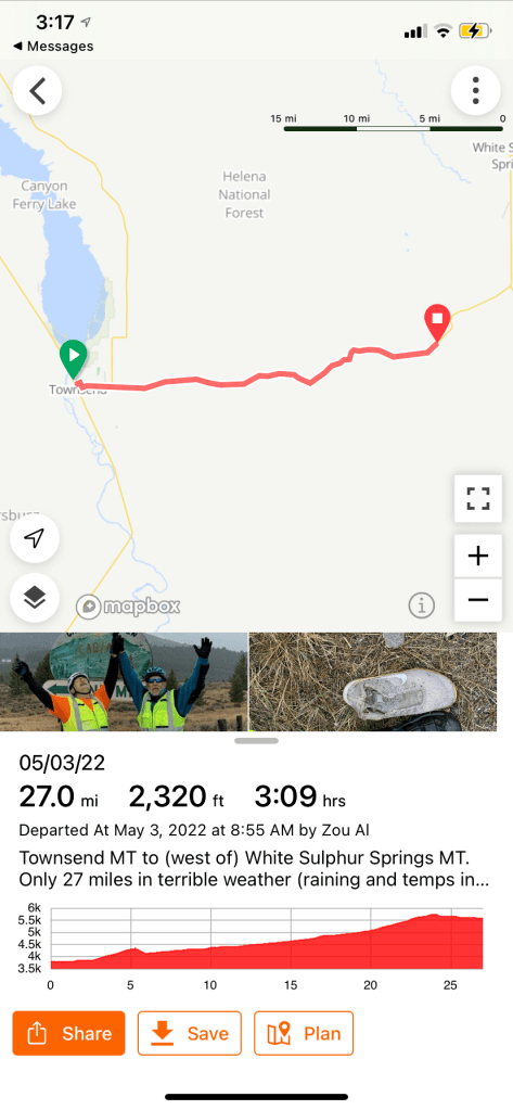 Townsend MT to (west of) White Sulphur Springs MT. Only 27 miles in rain and temps in the 40s…and 2321 feet of climb.