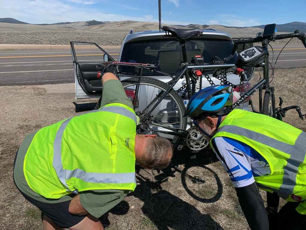 They are back on their bikes at 0835 with a temperature of 42° leaving the Montana DOT Deer Creek Station. “Don’t go far we don’t know if we have the right clothes on”. I didn’t go far and they asked me if I saw the speed goats that were in the field…nope I missed them.