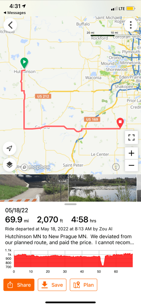 Day 30. Hutchinson MN to New Prague MN. 70 miles. 2051 feet of climb.