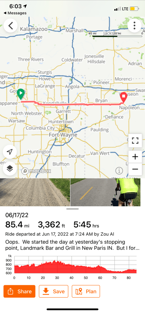 Day 42. New Paris IN to (near) Napoleon OH. Cooler temperatures (low 80s) and helpful tailwind. 90 miles. 3,362 feet of climb.