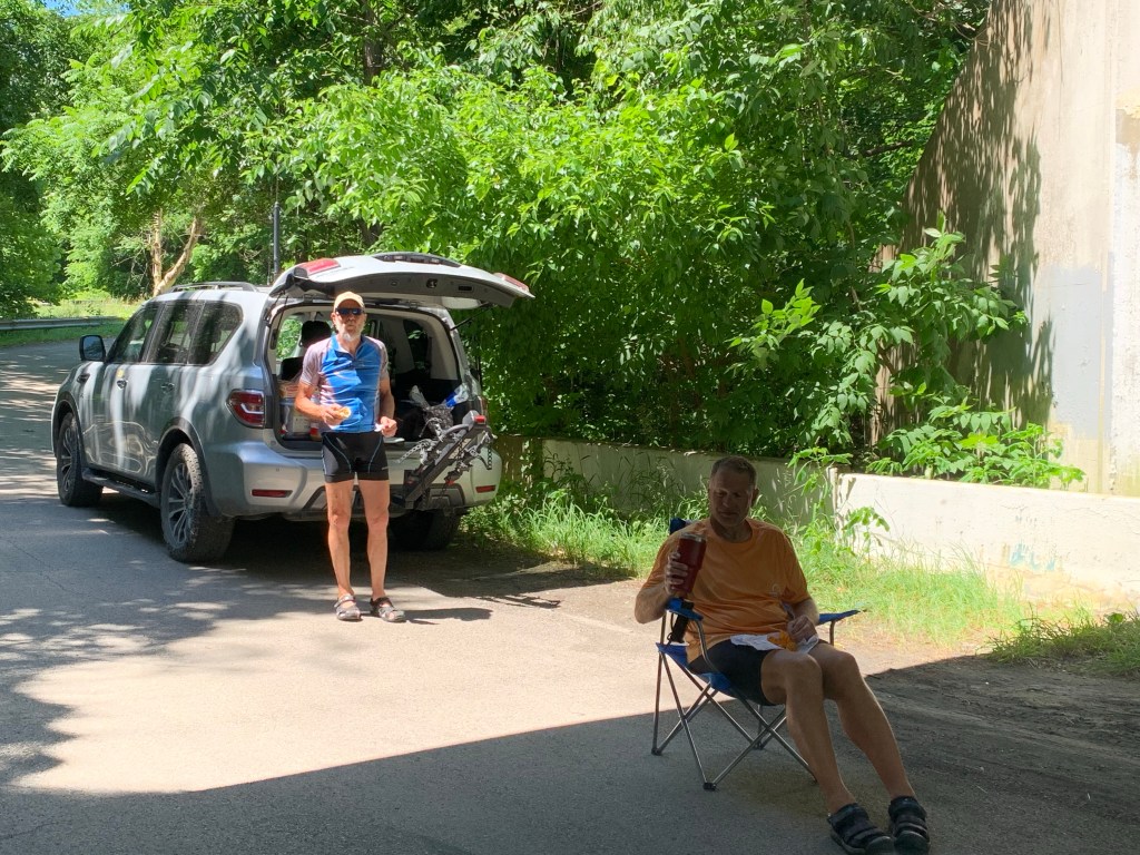 I made it to Ohiopyle trailhead and my (the slave driver) vote that we stop for the day. I’m parked in the shade with the bike rack ready to load bikes.