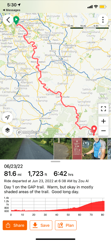 Al’s quote. Day 1 on the GAP trail was enjoyable. No cars. No hills. No problem.