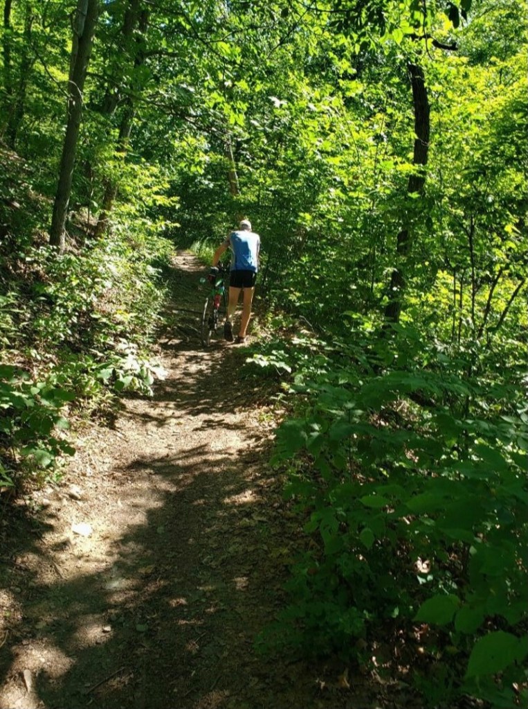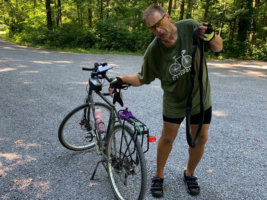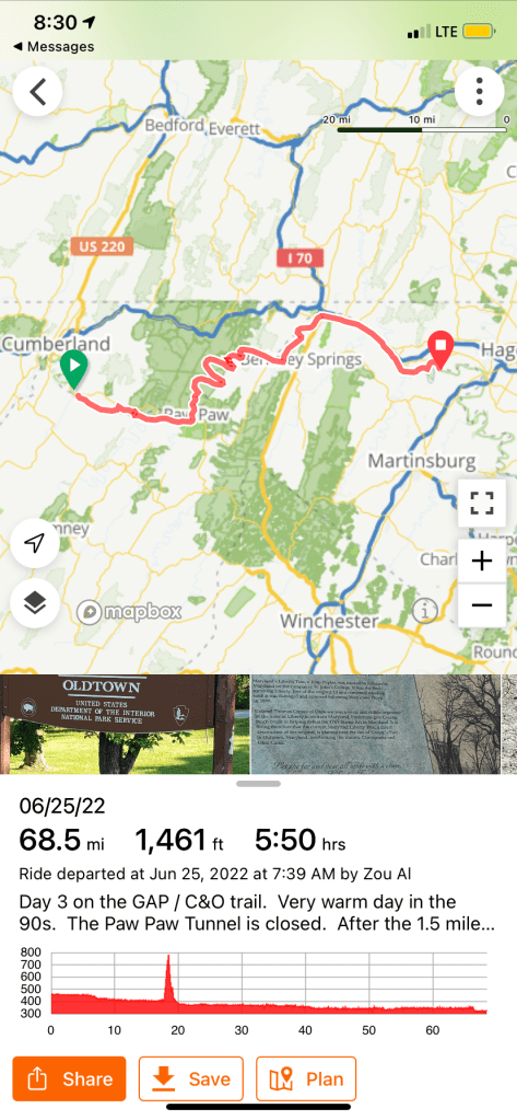 Day 49. Spring Gap MD to Clear Spring MD. 69 miles. 1,461 feet of climb. Closed tunnel with a 1.5 mile detour hike (with bike) up and over. Very warm. Multiple dips in the Potomac River to cool. First flat tire of the trip. Al struggled with the heat.